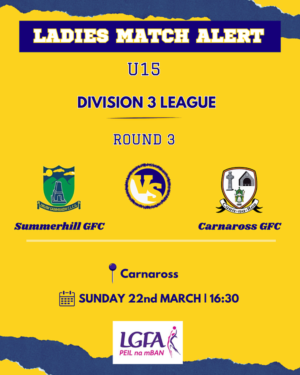 Our Summerhill U15 girls are playing tomorrow, Sunday, March 22nd, taking on Carnaross at 4:30 PM in Carnaross.